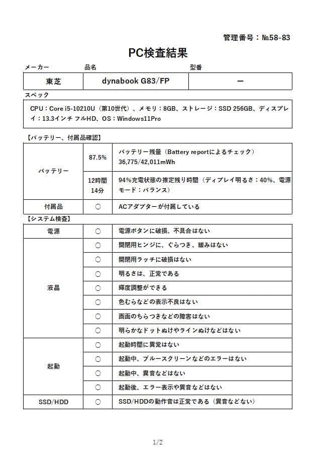 | 商品の特徴 |                  動作確認済み!全38項目\r≫詳細は写真の「PC検査結果」をご覧下さい\r\r出品時25,980円から大幅値下げ中♪\r\r/\r楽々持ち歩けて、カフェなど場所を選ばず作業したい学生や社会人におすすめ♡\r\\r\r・高性能なインテル第10世代CPUで快適&爆速\r・片手で軽々持てる本体重量 835g\r・ワードやエクセル で資料作成可能\r・初期設定済!電源ONで直ぐ使えます\r・Windows11正規対応品 だから、今後も永く使用可能\r\rしかも、美品! \r\r\フォロー割、開催中~♪/\r 詳しくはプロフィールにて☆\r\r#他の軽量パソコンを見てみる!\r\r\r■仕様\rメーカー:東芝\r品名:dynabook G83/FP\r型番:ー\r年式:2020年\rCPU:Core i5-10210U(第10世代)\rメモリ:8GB\rストレージ:SSD 256GB\rディスプレイ:13.3インチ フルHD\rOS:Windows11Pro \r搭載:Wi-Fi、Bluetooth、Webカメラ、マイク、スピーカー、USB、HDMI 他\rウィルス対策:Windows Defender\r\r付属品:ACアダプタ(純正品)\r\r\r ■インストール済みアプリ\r・Microsoft Edge\r・Google Chrom\r・Libre Office(Office互換ソフト)\r・LINE\r・Zoom\r\rオンラインOffice365にて、ワードやエクセル 、パワーポイントが使えます\r\r\r■外観\r・全体的にみて、良好状態です\r・詳しくは、写真をご覧ください \r\r\r■機能状態\r・写真の「PC検査結果」を参照ください\r・特に不具合なし\r\r\r■バッテリー\r・バッテリーレポートの残量 87.5%\r(中古の場合、80%以上で「良」、50%以下が交換の目安とされています)\r・94%充電状態で 12時間14分駆動の表示\r\r\r■その他\r・全国送料無料\r・即日、匿名発送\r・初期不良は到着後7日間保証致します(評価前にご連絡下さい)\r\r\r管理番号:№58-83